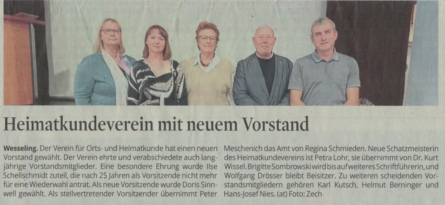 Zunächst einmal ganz herzlichen Dank, dass Sie auch in dieser so schweren Zeit unserem Verein die Treue gehalten haben. Leider konnten wir Ihnen aufgrund der Pandemie im letzten Jahr keine Veranstaltungen, Ausflüge und Reisen anbieten. Doch ist der Vorstand nicht untätig geblieben. So fanden, solange es möglich war, Vorstandssitzungen statt. Auch danach standen die Vorstandsmitglieder/innen in ständigem Austausch, die Arbeit ging weiter. Die Heimatblätter 74 und 75 haben Sie erhalten, Heft 76 ist in Arbeit. In Zusammenarbeit mit der Stadt Wesseling veröffentlichten wir auf you tube zwei Vorträge über „Wesseling – Weltkulturerbe?“ und „Wesseling im II. Weltkrieg“ – Näheres auf unserer Homepage. In Vorbereitung sind in Zusammenarbeit mit der Stadt (Frau Zech vom Stadtarchiv) ein Vortrag (analog oder digital) über die Wesselinger Juden im Rahmen der Veranstaltungen „1700 Jahre Juden in Deutschland“ sowie die Gestaltung des Denkmaltages (für die Durchführung ist jetzt auch Frau Zech verantwortlich).